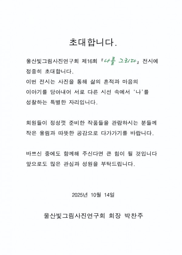 제16회 울산빛그림사진연구회 회원전 작성자 정보 운영자 작성 작성일 2025.10.01 13:05 컨텐츠 정보 24 조회 목록 본문 제16회 울산빛그림사진연구회 회원전♤전시기간 : 2025년10월14일(화)~10월20일(월)♤전시장소 : 울산문화예술회관 제2전시장♤관람시간 : 10:00~19:00 관련자료 다음 해오름 울포경 사진클럽 10주년 기념전 작성일 2025.09.17 15:55 댓글 0 등록된 댓글이 없습니다. 로그인한 회원만 댓글 등록이 가능합니다. 목록