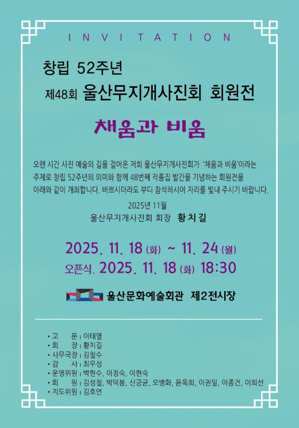 창립52주년 제48회 울산 무지개사진회 회원전 작성자 정보 운영자 작성 작성일 2025.11.11 13:05 컨텐츠 정보 34 조회 목록 본문 창립52주년 제48회 울산 무지개사진회 회원전일시 : 2025년 11월 18일(화) ~ 11월 24일(월)장소 : 울산문화예술회관 제2전시장오픈식 : 2025년 11월 18일(화) 18:30 관련자료 이전 경산일보사진연구회 제16회 회원전 작성일 2025.11.11 14:46 다음 흑백사진 연구회 2025 정기회원전 작성일 2025.11.04 14:04 댓글 0 등록된 댓글이 없습니다. 로그인한 회원만 댓글 등록이 가능합니다. 목록