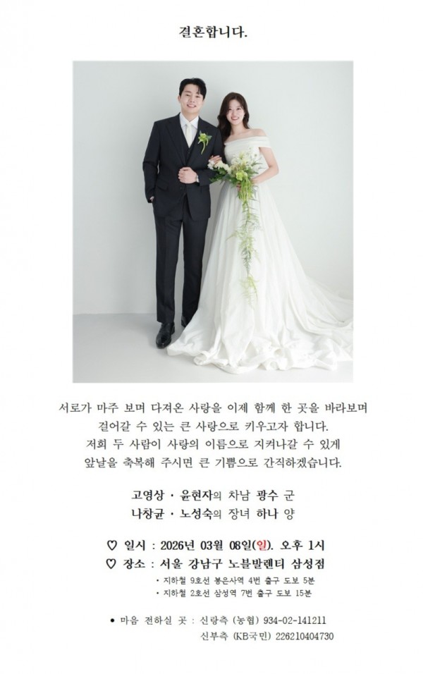 고영상 감사 차남 결혼안내 작성자 정보 운영자 작성 작성일 2026.02.24 08:16 컨텐츠 정보 67 조회 목록 본문 ●고영상회원 차남 결혼안내●♤일시:2026년 3월 8일(일) 오후1시♤장소:서울 강남구 노블 발렌티 삼성점♧마음 전하실곳: 고영상 (농협) 934-02-141211 관련자료 다음 김춘화회원 아들 결혼안내 작성일 2026.02.23 17:15 댓글 0 등록된 댓글이 없습니다. 로그인한 회원만 댓글 등록이 가능합니다. 목록