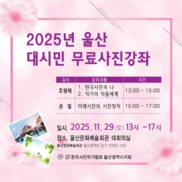 2025년 울산 대시민 무료사진강좌 작성자 정보 운영자 작성 작성일 2025.11.11 13:08 컨텐츠 정보 29 조회 목록 본문 일시 : 2025년 11월 29일(토) 13:00 ~ 17:00장소 : 울산문화예술회관 대회의실 관련자료 다음 문화예술회관 초청 기획전시(야외조각과 설치작품展) 작성일 2025.10.01 12:29 댓글 0 등록된 댓글이 없습니다. 로그인한 회원만 댓글 등록이 가능합니다. 목록