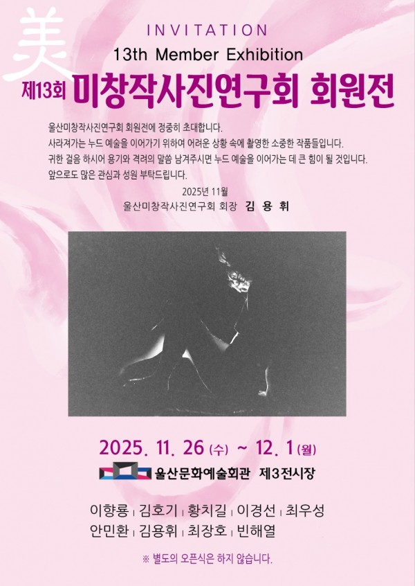제13회 미창작사진연구회 회원전 작성자 정보 운영자 작성 작성일 2025.11.17 18:40 컨텐츠 정보 16 조회 목록 본문 제13회 미창작사진연구회 회원전♤전시기간 : 2025년11월26일(수)~12월01일(월)♤전시장소 : 울산문화예술회관 제3전시장 관련자료 다음 중문포토웍스 사진전 11th 작성일 2025.11.13 12:46 댓글 0 등록된 댓글이 없습니다. 로그인한 회원만 댓글 등록이 가능합니다. 목록
