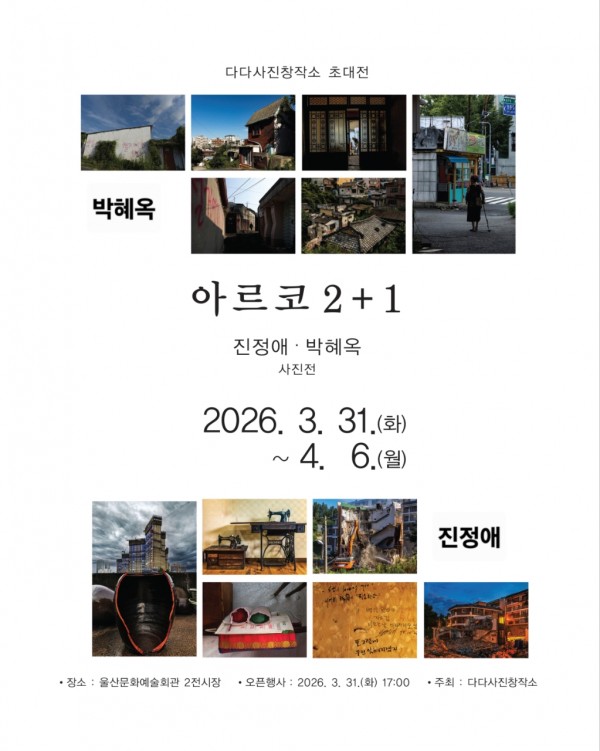 다다사진 창작소 초대전 아르코 2+1 작성자 정보 운영자 작성 작성일 2026.03.21 16:22 컨텐츠 정보 313 조회 목록 본문 다다사진 창작소 초대전아르코 2+1진정애.박혜옥 사진전일시 : 2026년 3월 31일(화) ~ 2026년 4월 6일(월)장소 : 울산문화에술회관 제2전시장오픈행사: 2026년 3월31(화)주최: 다다사진창작소 관련자료 이전 뉴 푼크툼 특별기획전 작성일 2026.03.24 16:09 다음 "Fe_26_(철)미학의 재구성" 사진전 작성일 2026.01.26 21:31 댓글 0 등록된 댓글이 없습니다. 로그인한 회원만 댓글 등록이 가능합니다. 목록