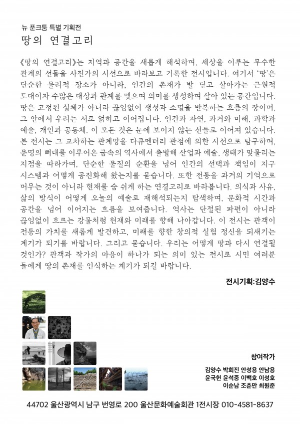 뉴 푼크툼 특별기획전 작성자 정보 운영자 작성 작성일 2026.03.24 16:09 컨텐츠 정보 292 조회 목록 본문 뉴 푼크툼 특별기획전 장소:울산문화예술회관제1전시장 전시:26년4월1일~4월6일 오픈행사:26년3월31일(화)오후3시 관련자료 이전 "울산100인사진제" 작성일 2026.04.06 12:00 다음 다다사진 창작소 초대전 아르코 2+1 작성일 2026.03.21 16:22 댓글 0 등록된 댓글이 없습니다. 로그인한 회원만 댓글 등록이 가능합니다. 목록