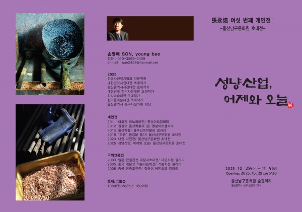 손영배 자문위원 여섯 번째 개인전 개최(성냥산업의 어제와 오늘) 작성자 정보 운영자 작성 작성일 2025.10.23 11:34 컨텐츠 정보 259 조회 목록 본문 손영배 자문위원 여섯 번째 개인전 개최(성냥산업의 어제와 오늘)일 시 : 2025년 10월 29(수) ~ 11월 4일(화)장 소 : 울산남구문화원 숲갤러리Opening : 2025년 10월 29일 Pm : 6 :30 관련자료 이전 이병록 회원 20번째 개인전 안내 작성일 2025.10.29 12:42 다음 '조원채 사진 산문집 출판기념 사진전'개최 작성일 2025.10.22 12:18 댓글 0 등록된 댓글이 없습니다. 로그인한 회원만 댓글 등록이 가능합니다. 목록