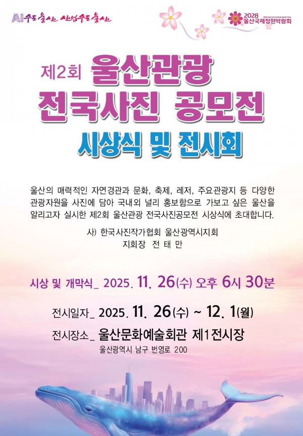 제2회 울산관광 전국사진 공모전 시상식 및 전시회 개최 작성자 정보 운영자 작성 작성일 2025.11.17 18:48 컨텐츠 정보 353 조회 목록 본문 제2회 울산관광 전국사진 공모전 시상식 및 전시회 개최시상식 및 개막식 : 2025년 11월 26일(수) 오후 6시 30분전 시 장 소 : 울산문화예술회관 제1전시장전 시 일 자 : 2025.11.26(수) ~ 12.1(월) 관련자료 이전 “2025년 문화예술회관초청 기획전시 야외조각과 설치작품전 전시연장” 작성일 2025.11.18 15:39 다음 2025년 울산 대시민 무료사진강좌 작성일 2025.11.11 13:08 댓글 0 등록된 댓글이 없습니다. 로그인한 회원만 댓글 등록이 가능합니다. 목록